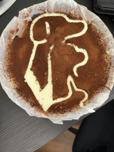 Susanne had als bedankje voor haar stage een heerlijke zelfgemaakte cheesecake meegenomen, met ons logo! Een heel leuk gebaar en natuurlijk lekker voor in de pauze!