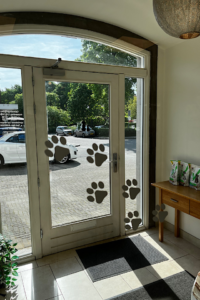 Misschien is het u al opgevallen: onze ingang heeft een kleine metamorfose ondergaan! Om het voor u (en uw dier) nog duidelijker en leuker te maken, hebben we de glazen deuren voorzien van opvallende stickers met dierenprint.