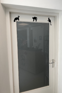 Naast dat het er vrolijk uitziet, zorgt het er ook voor dat de glazen deuren beter zichtbaar zijn voor zowel mens als dier – wel zo veilig én uitnodigend.